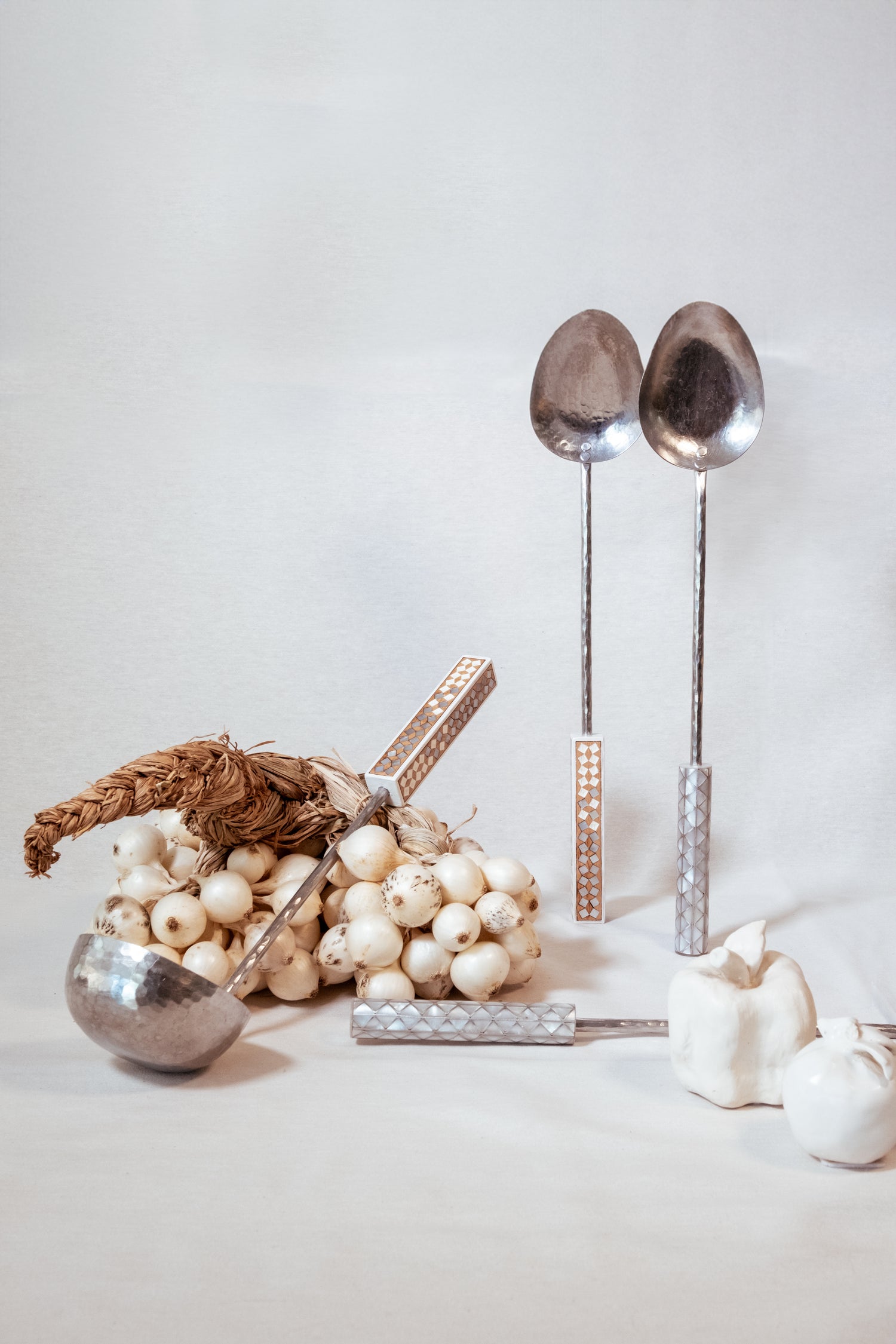 The “Hanne w Manne” tableware collection is designed by Carole Tarazi. It is composed of bejewelled serving spoons in white brass and wood embellished with coloured marquetery or mother of pearl inlay. These pieces are entirely handmade