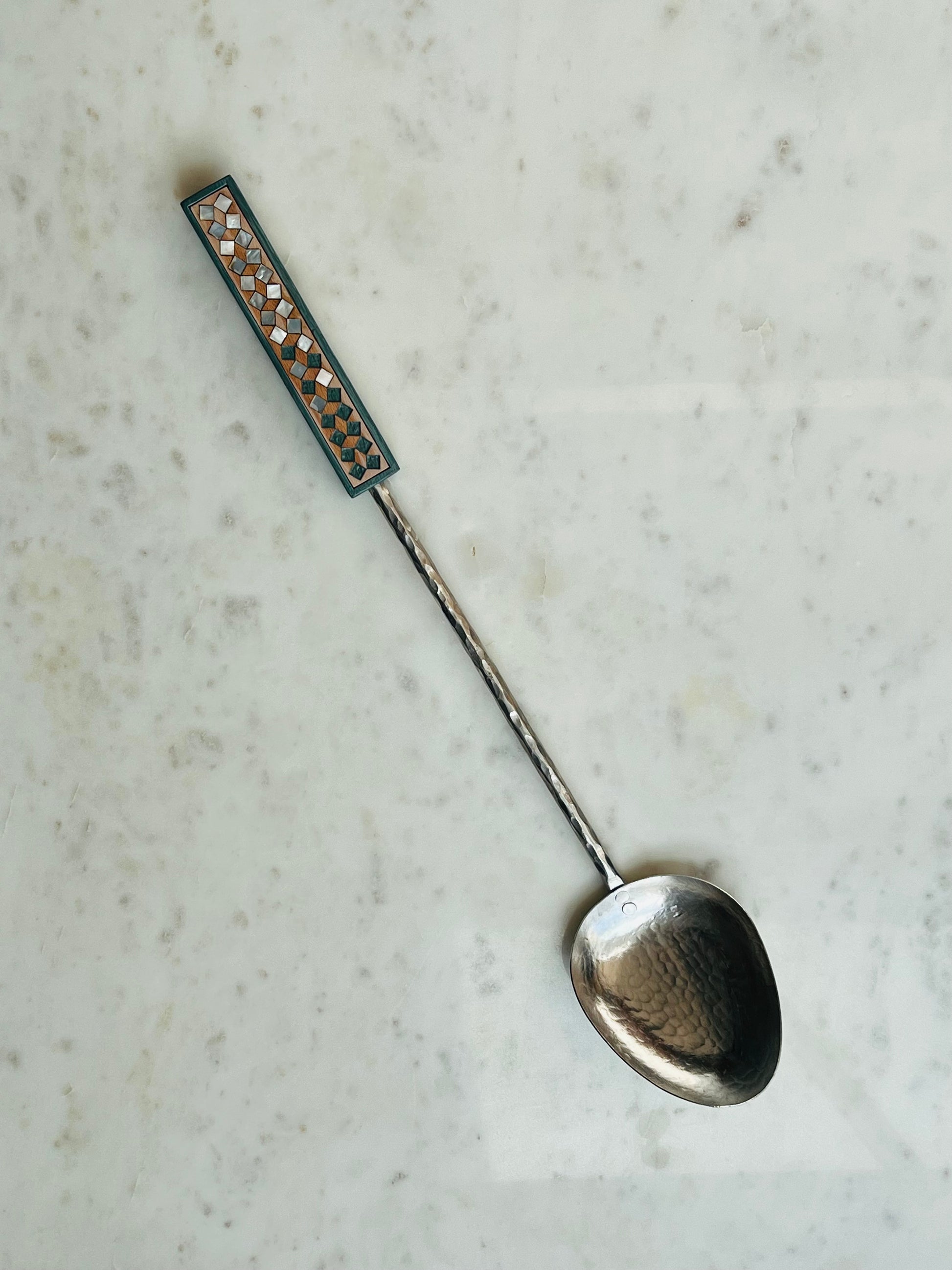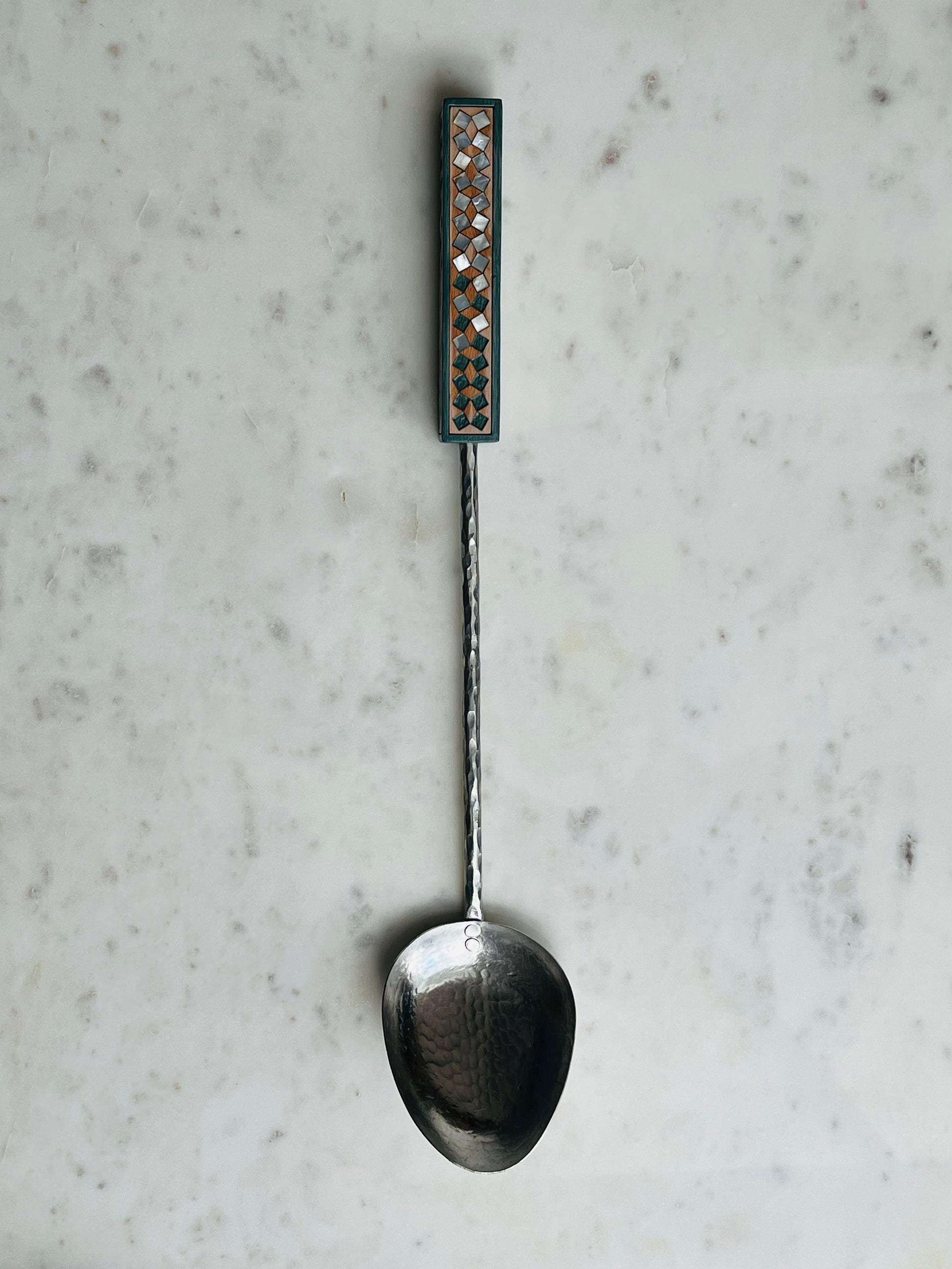 You save"Hanne w Manne" serving spoon is a timeless bejewelled utensil in white brass and wood with mother of pearl marquetry